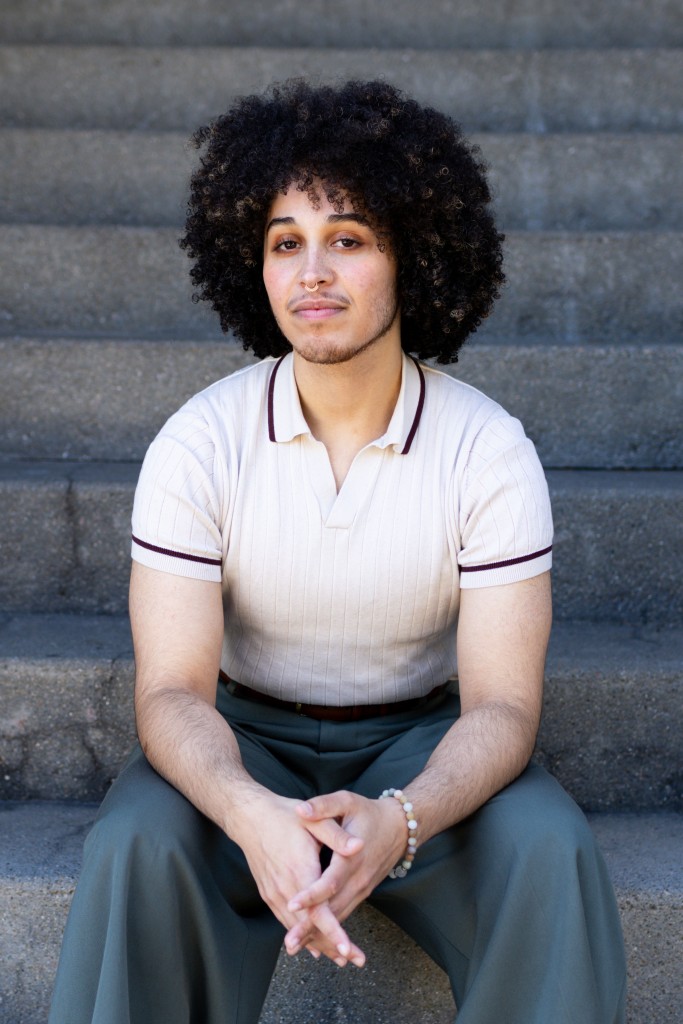 EZRA FOX is a Best of the Net nominee who lives and writes in San Francisco, CA, and holds an MFA in Creative Writing from Indiana University. A Tin House and Lambda Literary Fellow, and recipient of the Lili Elbe Memorial Scholarship for promising transgender writers, Ezra’s work appears in TriQuarterly, The Pinch, Fourteen Hills, and elsewhere. Additionally, they won the 2025 West Trade Review Poetry Prize, and was selected as a finalist for poetry prizes from Palette Poetry, Bellingham Review and Birdcoat Quarterly. More of their work can be found at their website, or on Instagram @ezraxfox. Image Description: Ezra, a Black trans masc poet with a large curly afro and gold septum ring, sits on concrete steps leaning forward with their arms resting on their knees, looking directly at the camera. They wear a beige polo with brown striped accents and dark green pants. Photo by Sarah Deragon. |