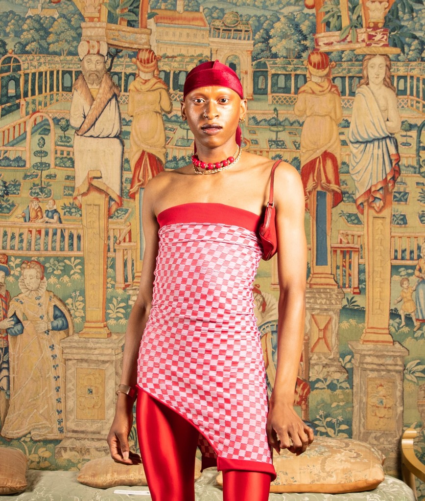 Golden’s published & collaborative work can be found on Instagram (@goldenthem_) or through their website. Image Description: Golden, wearing a red velvet durag, a red & white strapless top, glossy red leggings & a red shoulder bag, stands in front of a gold & red tapestry. Photo by Golden, in collaboration with the Isabella Stewart Gardner Museum. |